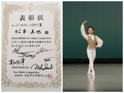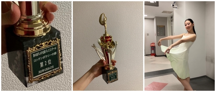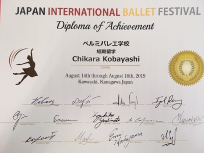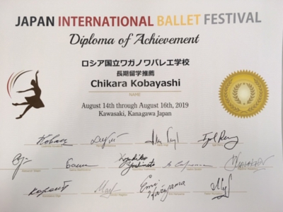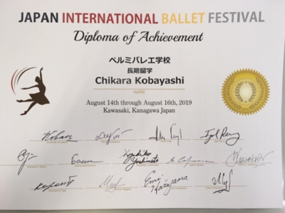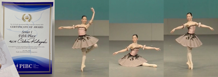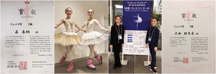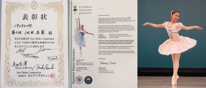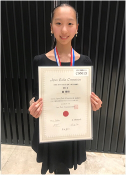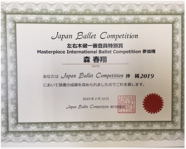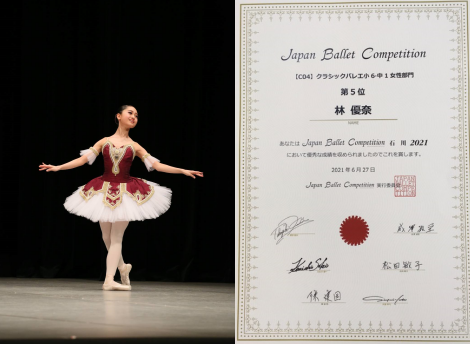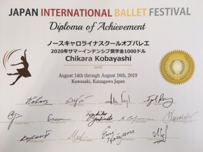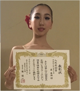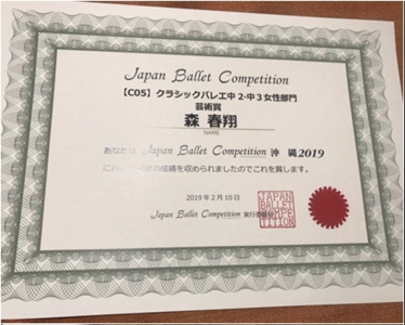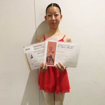 - 日本国際バレエフェスティバルのコンクールで、奨励賞とアメリカノースカロライナバレエアカデミーのスカラーシップを頂きました。
