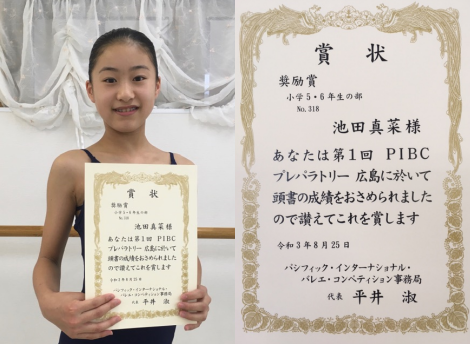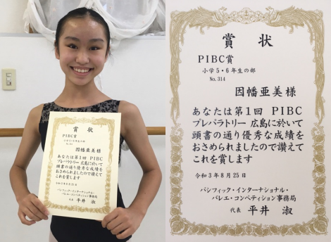 - 2021年8月パシフィックインターナショナルバレエコンペティションPIBCプレパラトリー広島において、下記の成績をおさめました。